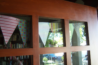 Pennant banners, or bunting, cut from 12" scrapbook paper in the color scheme of the holiday or season, in this case back-to-school primary colors. Also included below is the apple flag in front of the home.
